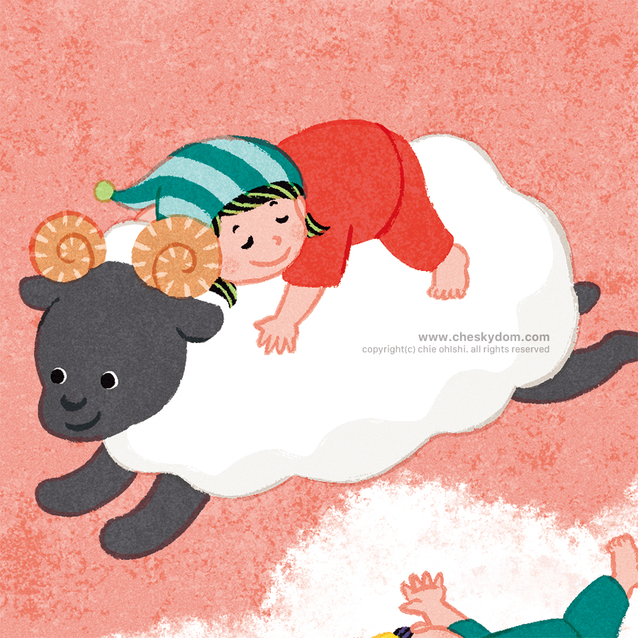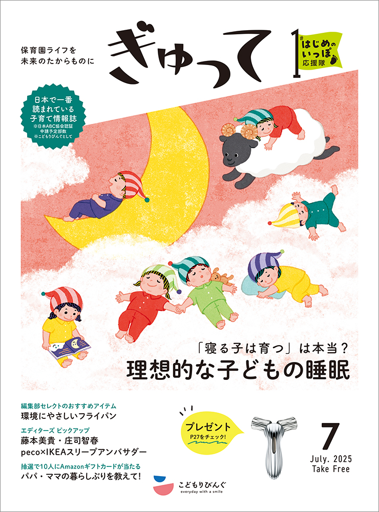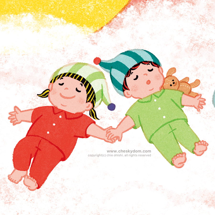 こどもりびんぐ発行フリーマガジン『ぎゅって』7月号表紙イラストです。今月は「理想的な子どもの睡眠」特集ということで、空の上で眠る子どもたちを描きました。イラスト 表紙 子ども