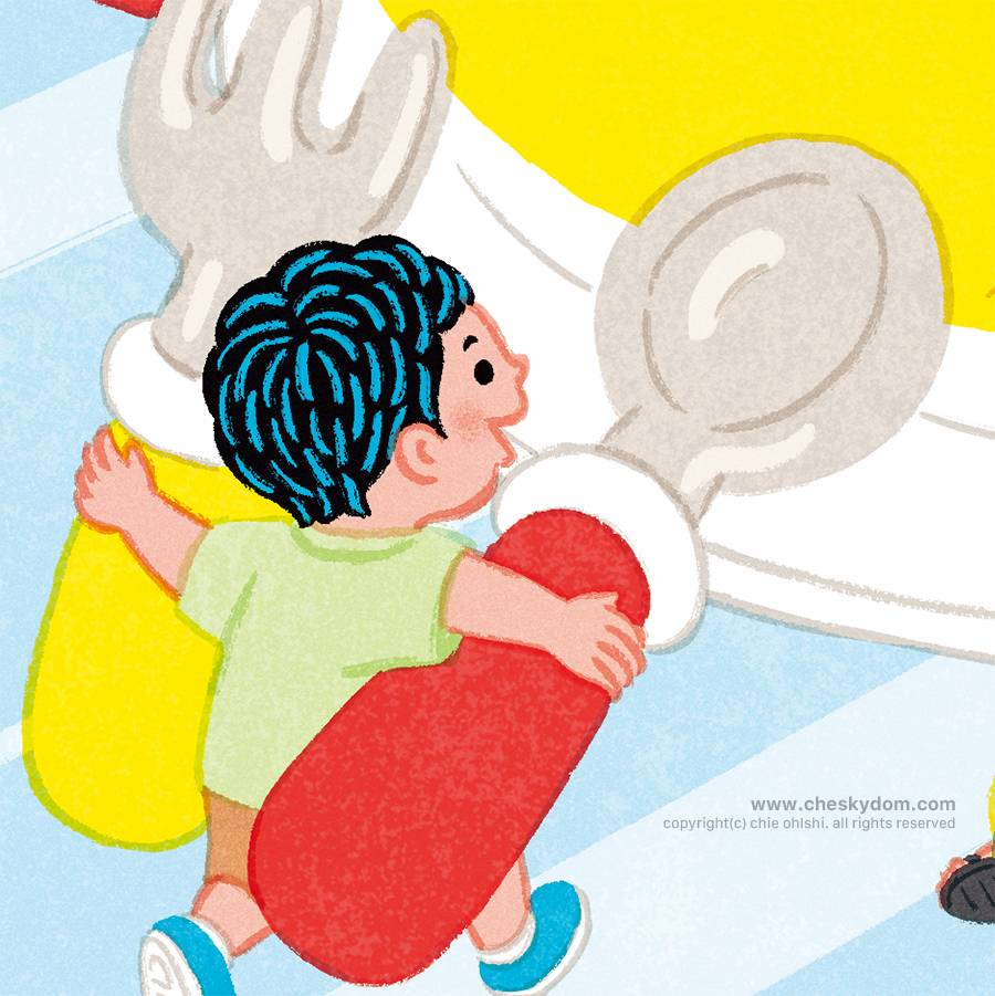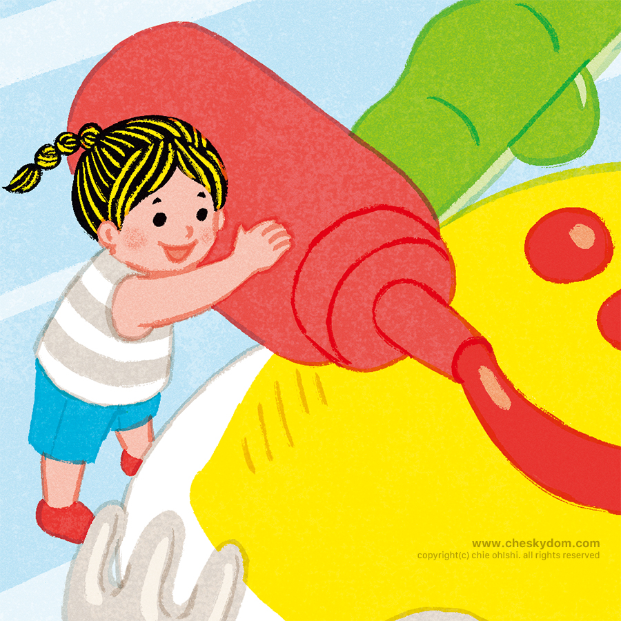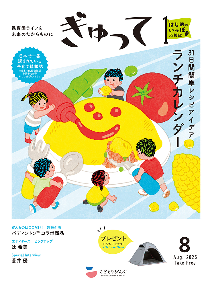 こどもりびんぐ発行フリーマガジン『ぎゅって』8月号表紙イラストです。今月は夏休みの「ランチカレンダー」特集ということで、オムライスを作る子どもたちと夏野菜を描きました。