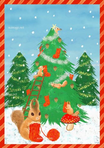 エゾリスたちが、クリスマスツリーの飾りつけをしているイラストです。