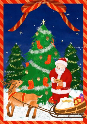 リスがぶらさげた赤い靴下の中に、たくさんどんぐりを入れていくサンタクロースのイラスト