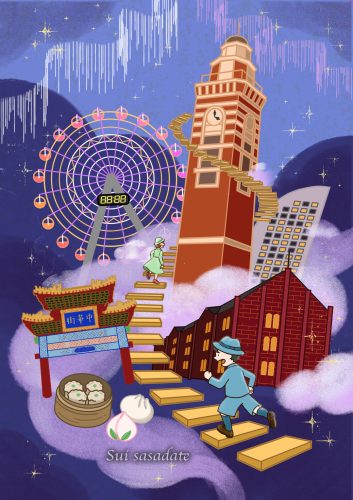 中華街のグルメ、赤レンガ倉庫、ヨコハマグランドインターコンチネンタル・ホテル、横浜市開港記念館、コスモクロック21を配置して、ちょっとクラシカルなファッションの人物が階段を登っていく場面を描きました。