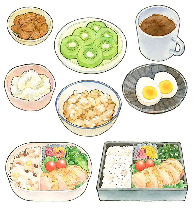 制作会社様にご依頼いただき、フィットネスジム『FITNESS24』パンフレット用に料理のイラスト21点を制作しました。