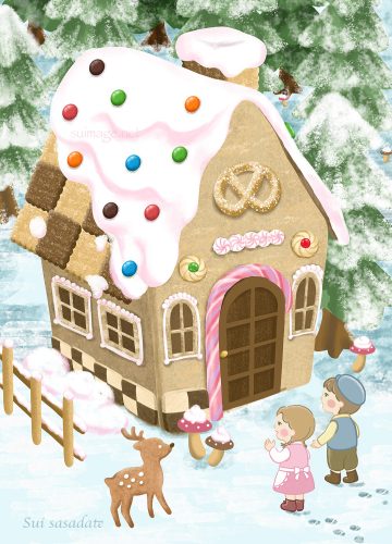 森の中のお菓子の家から現れるジンジャーブレッドマンと、クッキーでできた動物たちに驚く少年少女をかわいいファンタジー調に描きました。。